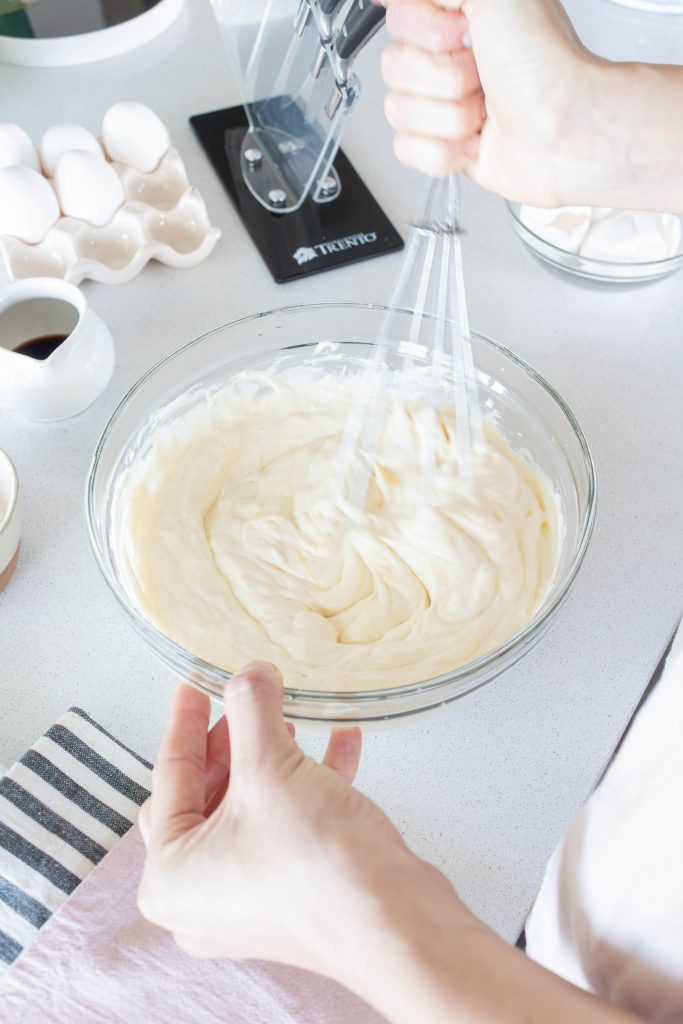 Para el relleno: mezclar el queso crema con el azúcar, la vainilla y un poco de café diluido con el almidón de maíz. Agregar los huevos de a uno, mezclando bien entre cada adición.