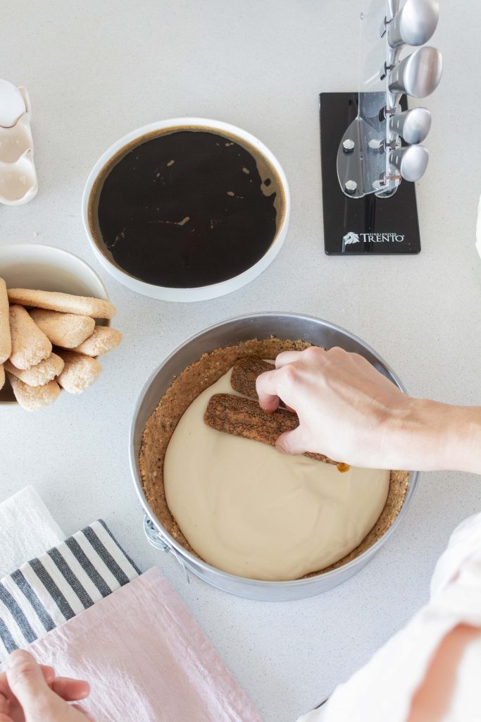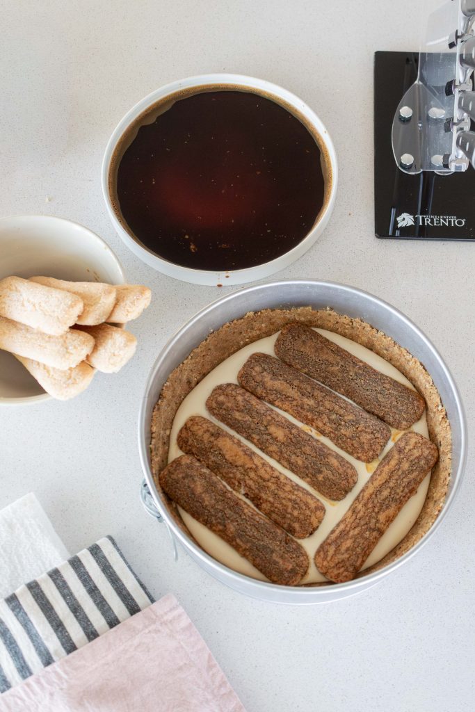 Colocar parte de la mezcla sobre la base de galletitas. En el centro, ubicar las vainillas remojadas en café.