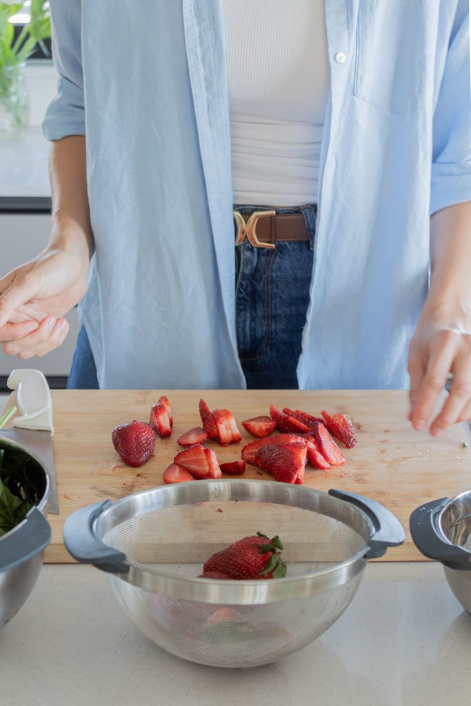 - Cortar frutillas, palta y cebolla morada.