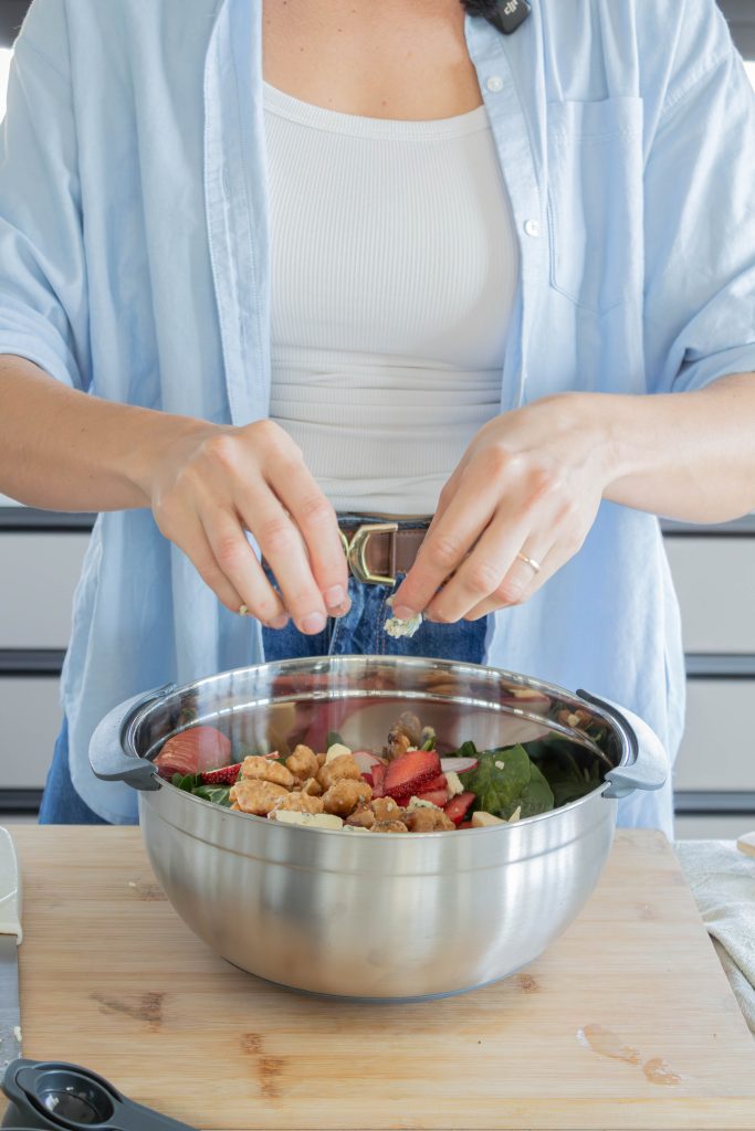 - Agregar frutillas, nueces caramelizadas y queso azul desmenuzado.