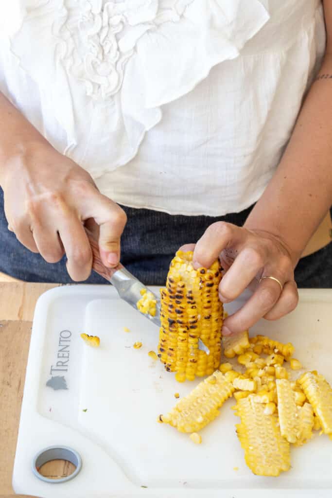 Blanqueá el choclo en agua hirviendo durante 5 minutos. Después, llevalo a la parrilla y doralo bien por todos sus lados hasta que tome color.