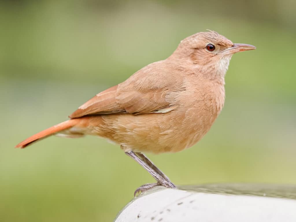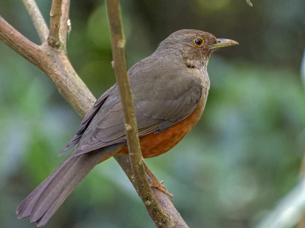 Zorzal colorado. Habitual en jardines, canta al amanecer con una melodía profunda y serena. Su pecho anaranjado resalta entre verdes y sombras.