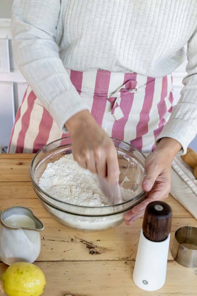 - En un bowl, mezclar la harina, los quesos rallados, la sal y la manteca fría en cubos.
