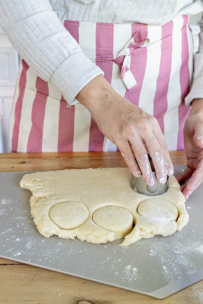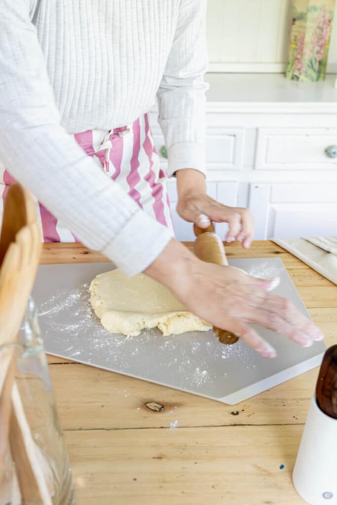 - Volcar sobre la mesada, formar un bollo y estirar hasta 1,5 cm de espesor.