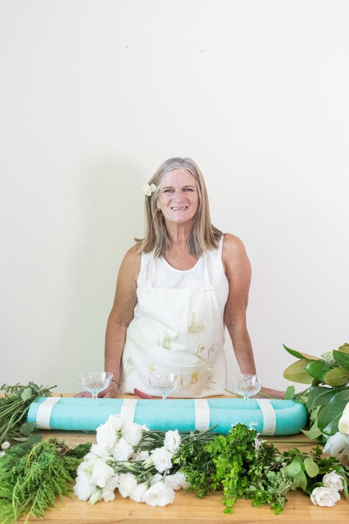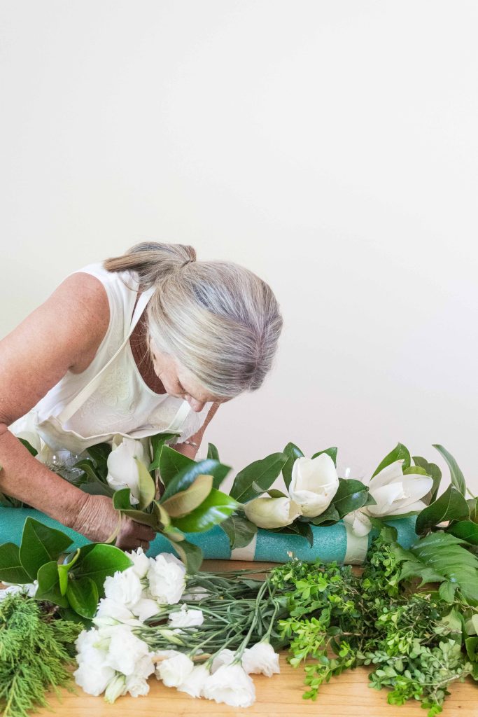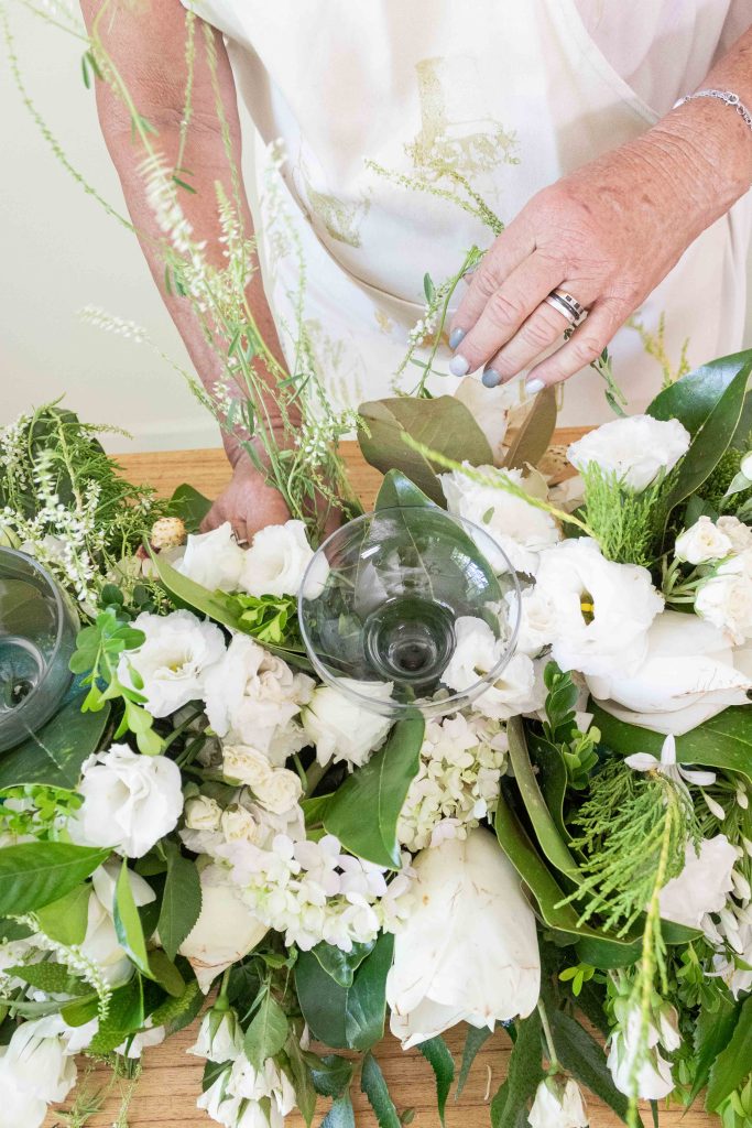 A continuación se colocan las flores, trabajando desde los bordes hacia el centro. Las más voluminosas van primero y las más livianas después. Para el toque final, Itasflower suma flores etéreas que aportan altura y una sensación de ligereza.