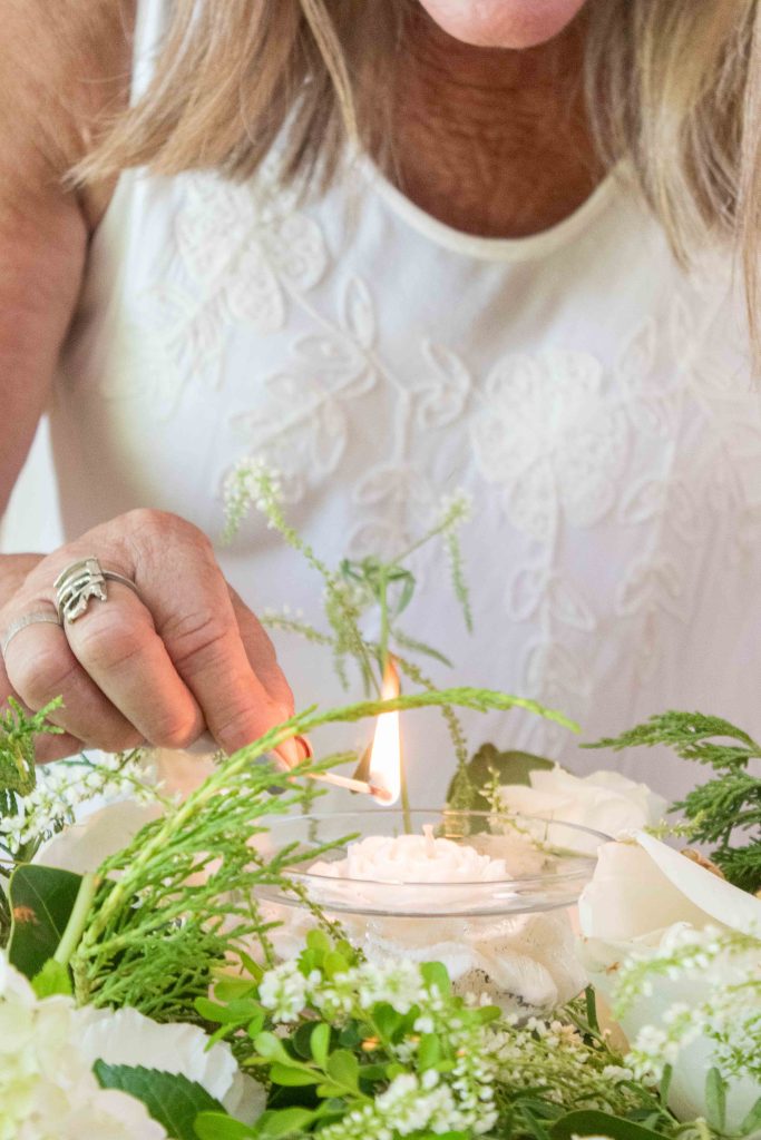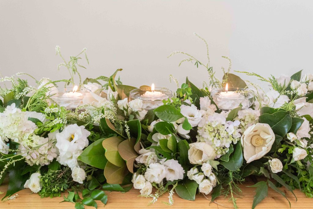 El arreglo se acompaña con copas altas llenas de agua y velas flotantes. Cuando se encienden, la luz se refleja en el agua y realza los verdes y blancos de las flores, creando un clima cálido y festivo.